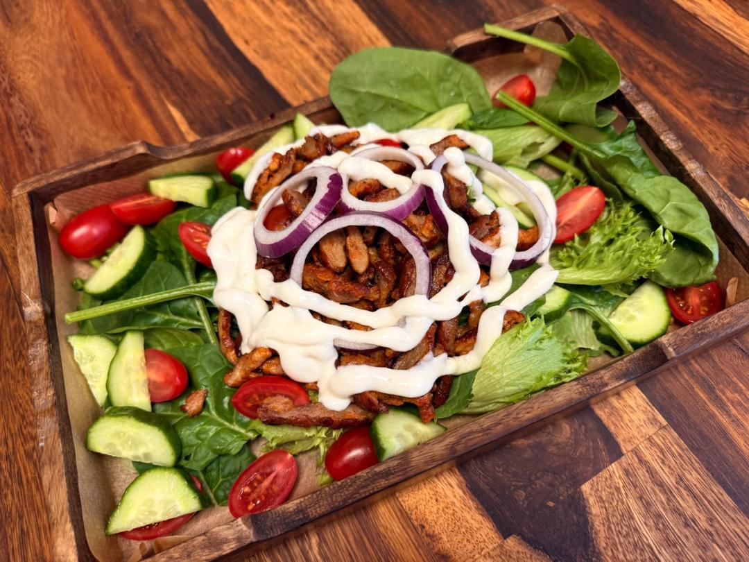 Gyros, krispsallad, spenat, plommontomater, gurka, rödlök, peparoni.