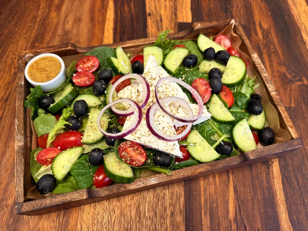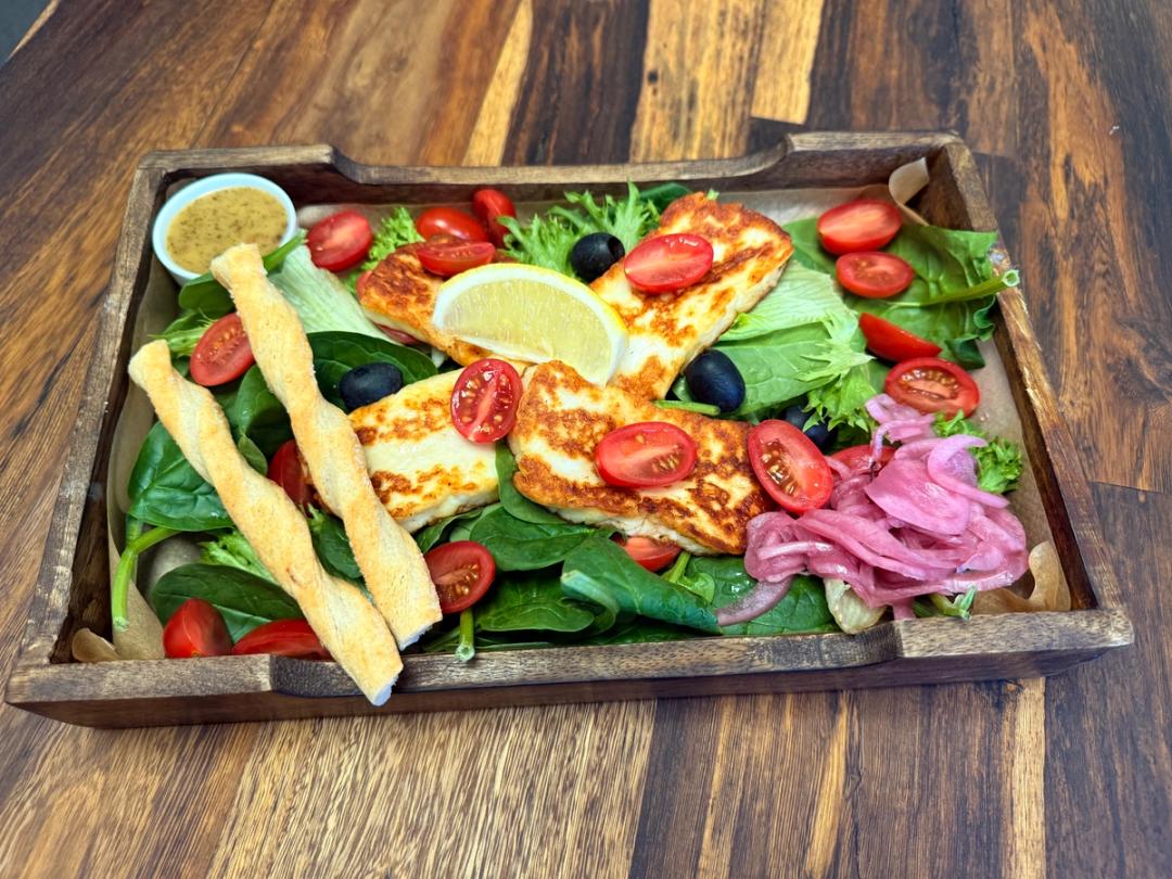 Halloumi, krispsallad, spenat, plommontomater, picklad rödlök, svarta oliver, smördegsstänger, citronklyfta. Serveras med valfri dressing på sidan.