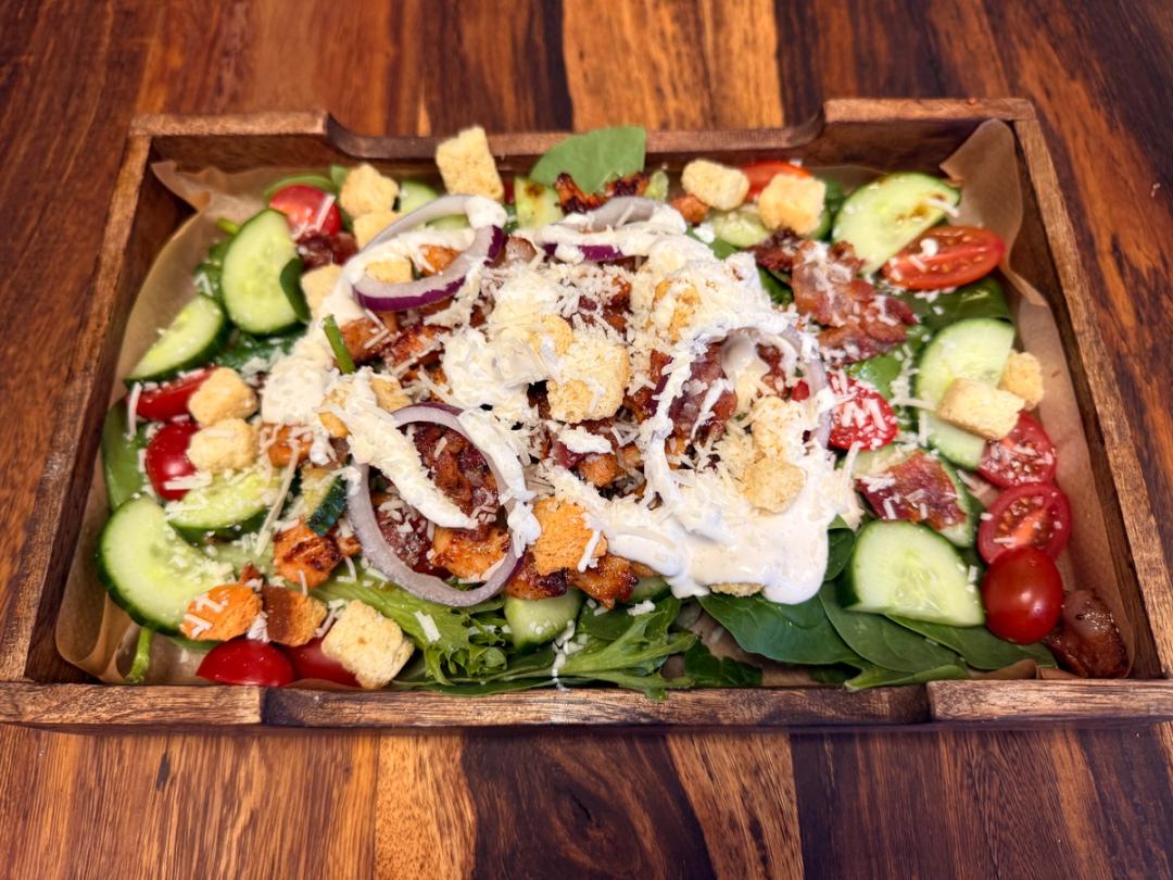 Kyckling, beacon, romansallad, plommontomater, gurka, rödlök, krutonger.