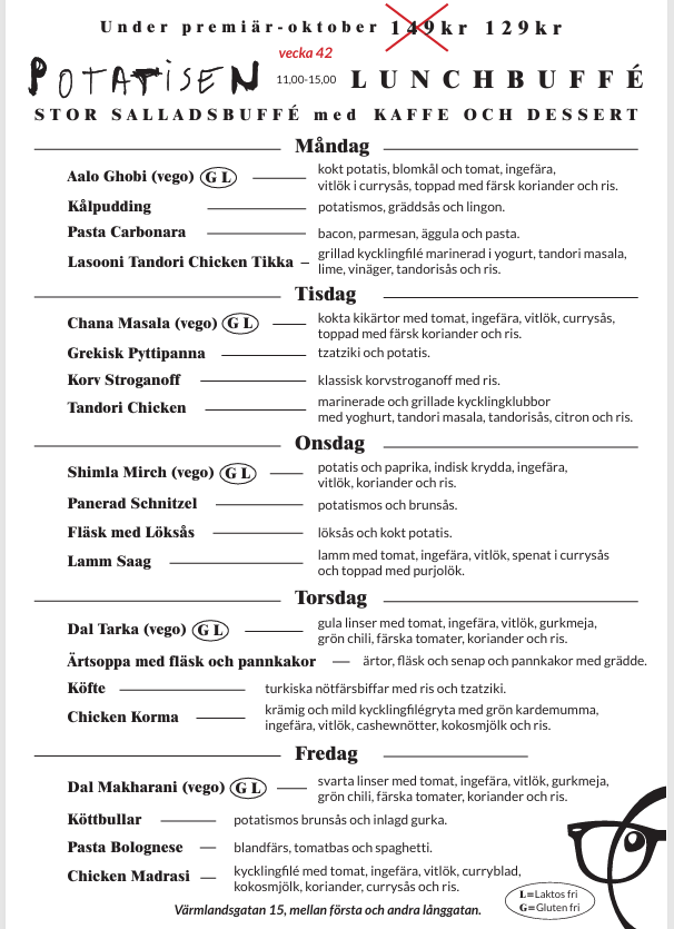 Potatisen välkomnar er alla till lunchbuffé där salladsbuffé och kaffe med dessert serveras. (Gäller vardagar mellan 11:00-15:00)