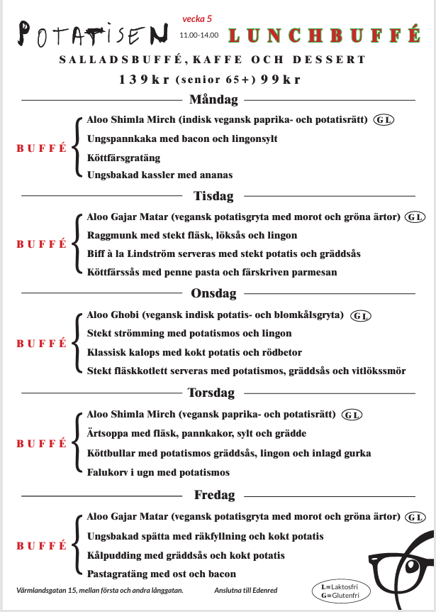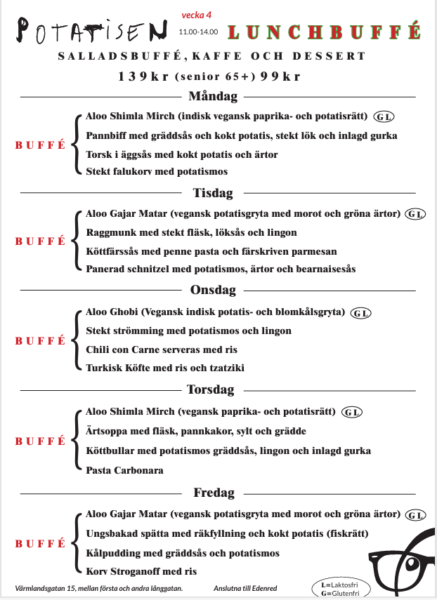 Potatisen välkomnar er alla till lunchbuffé där salladsbuffé och kaffe med dessert serveras. (Gäller vardagar mellan 11:00-14:00)